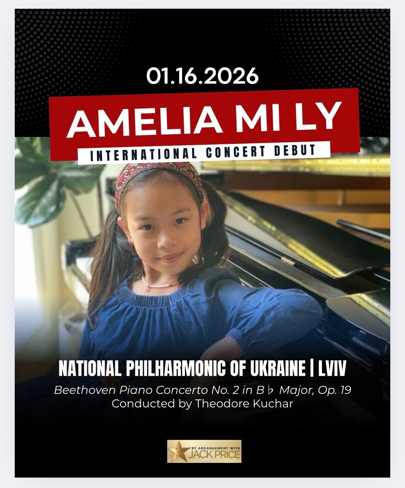 In March 2023, Amelia played with her teacher Craig Nies for Rachmaninoff’s 150th birthday celebration, and again in March 2025 for Ravel’s. At seven years old, Amelia performed as a guest artist with the Peoria Symphony Orchestra, and in 2024, performed with Maestro David Wroe at Carnegie Hall—a partnership that led to her featured appearance at the New Jersey Festival Orchestra’s 2025 annual gala. These milestones propelled her toward this week’s Lviv performance, which features Maestro Theodore Kuchar, whose career is profoundly rooted in Ukraine’s leading ensembles and supported by one of the most extensive discographies of his generation. Following this week’s January 16, 2026, performance, Amelia returns to Europe in October 2026 for further work with the Budapest Philharmonic and Maestro Rico Saccani. On October 11, 2026, she’ll perform Mozart’s double piano concerto with the University City Symphony under Leon Burke, followed by the San Gabriel Valley Symphony and Sheridan Solisti in Chicago. Then in 2027, reengagement with the New Jersey Festival Orchestra, San Angelo Symphony with Hector Guzman, the Peoria Symphony Orchestra under George Stelluto, and Abilene Philharmonic under David Itkin.